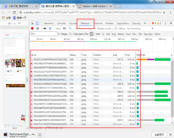 3. 接着在开发者页面找到"Network",接着刷新页面,这时就可以看到审查元素中各元素的加载情况,找到 type 下面 video/mp4 等视频格式,然后单击点开该文件;