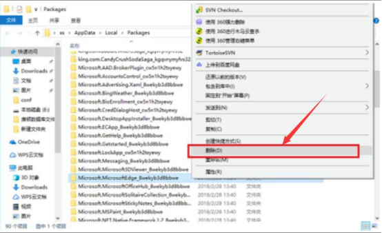 2. 然后,要解决 Microsoft Edge 闪退的问题,就要找到"Microsoft.MicrosoftEdge_8wekyb3d8bbwe"这个文件夹,右键单击它,并在右键菜单中点击"删除",从而卸除原来的 Microsoft Edge。