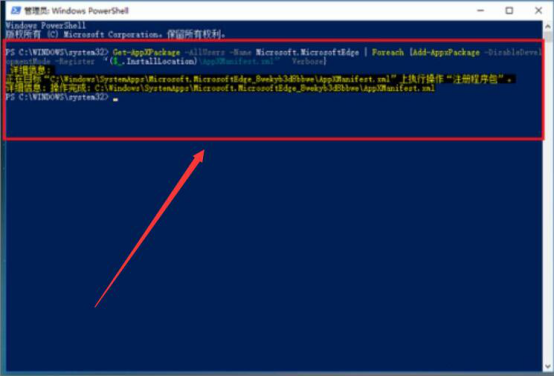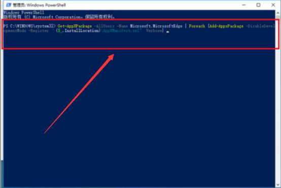 4.随后,便会进入管理员的命令行。在命令行中,参考下图,输入"Get-AppXPackage -AllUsers -Name Microsoft.MicrosoftEdge | Foreach {Add-AppxPackage -DisableDevelopmentMode -Register "$($_.InstallLocation)\\AppXManifest.xml” -Verbose}"的命令,再按一下电脑的回车键以确定该操作。