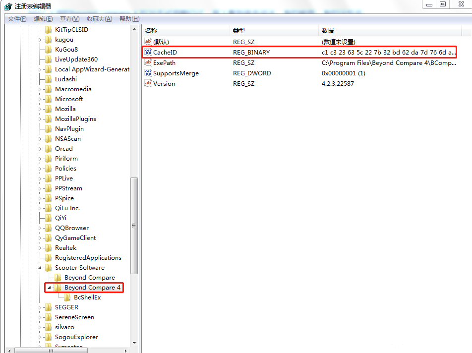 2. 如图,依次展开"计算机\\HKEY_CURRENT_USER\\Software\\Scooter Software\\Beyond Compare 4",找到 CacheId 并删除,