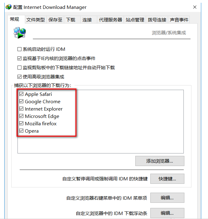 如图,打开"配置 Internet Download Manager"面板,点击"常规"——"捕获以下浏览器的下载行为",软件默认添加了一些常用浏览器,因为我使用的是谷歌浏览器,所以将其勾选,