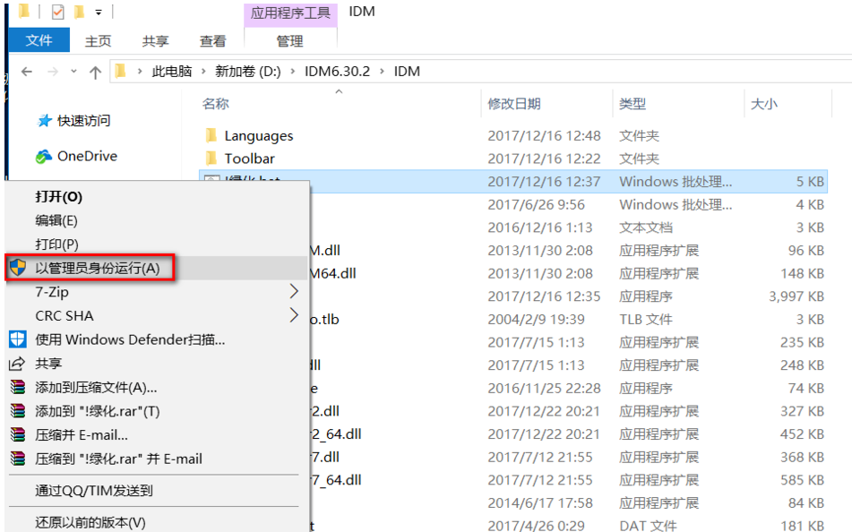首先下载 Internet Download Manager,小编这里找到的是绿色破解版,解压压缩包,如图所示,有一个"绿化.bat"的文件,