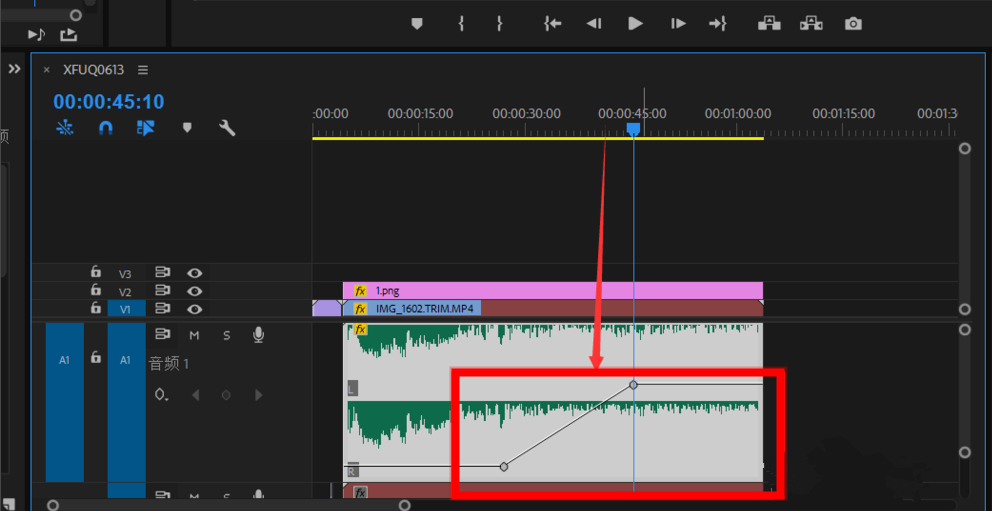 再在后面添加一个新的关键帧,将两个数值进行调整,就可以实现声音过渡的效果,