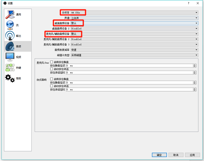 7. 左侧选项中选择"音频",然后右侧“采样率”设置为 44.1khz,其他默认,点击"确定"。