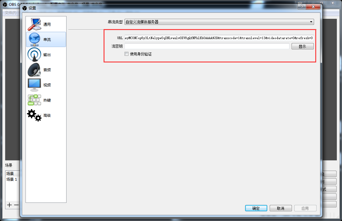 6. 弹出设置窗口,在左侧选项中选择"串流",然后右侧“串流类型”选择"自定义流媒体服务器",“URL”中粘贴之前复制的推流地址,其他默认,点击"应用"即可。