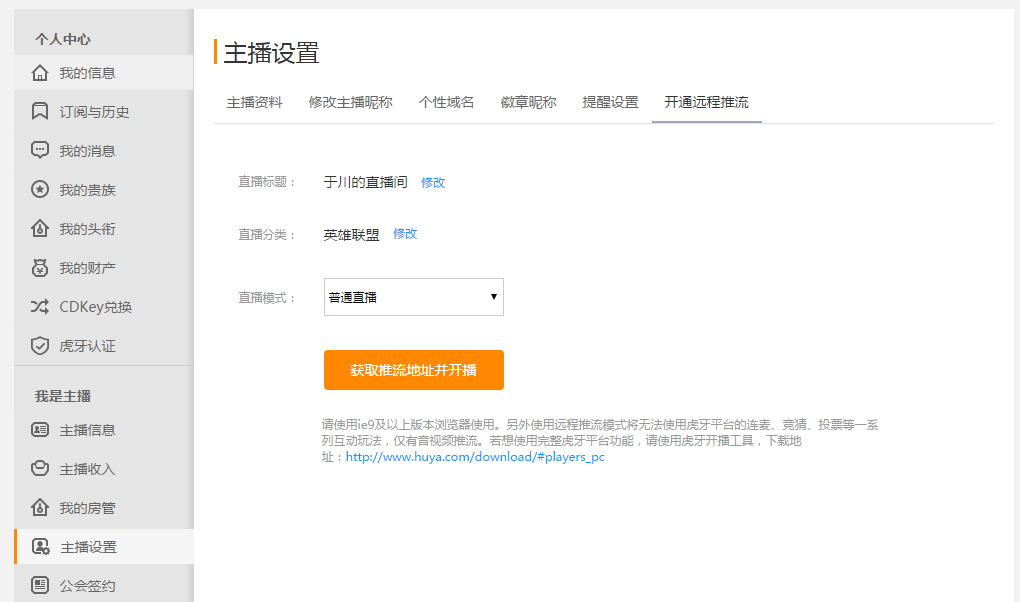 2. 打开虎牙直播官网(http://i.huya.com)并登录账号,点击"个人中心",在左侧菜单栏中选择"主播设置",然后在主播设置下面的选项中选择"开通远程推流"。