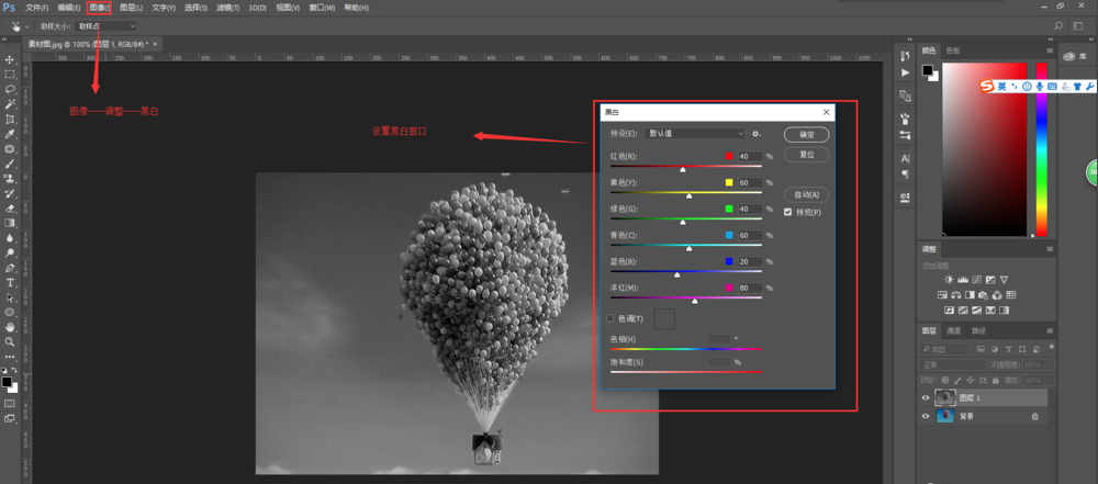 方法 3. 通过 PS 中的黑白命令实现黑白效果,选择菜单栏中"图像"——"调整"——"黑白",弹出"黑白"设置窗口,进行适当设置,点击确定即可。