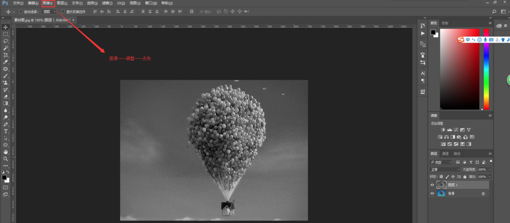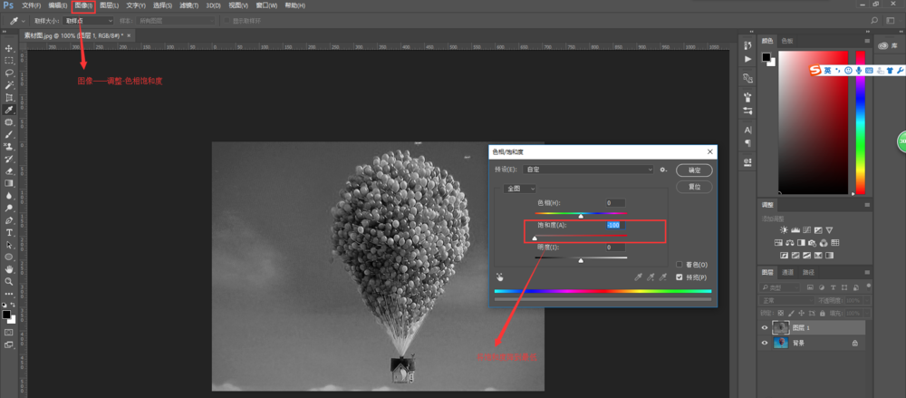 方法 2. 通过"色相/饱和度"来进行调整,选择菜单栏中"图像"——:调整"——"色相/饱和度",在弹出的色相饱和度窗口中,将饱和度降到最低,即可实现黑白灰效果。