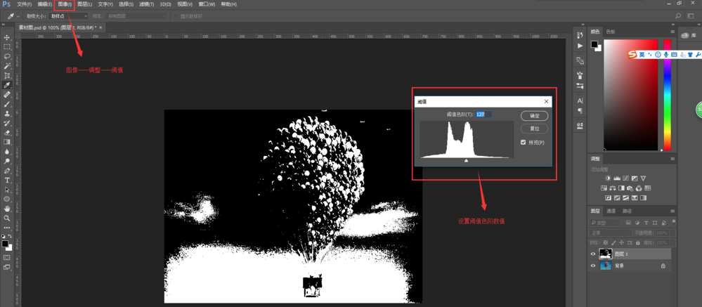 方法 8. 利用"阈值",选择菜单栏中"图像"——"调整"——"阈值",通过阈值形成的图像是通过色阶不同非黑即白,凡是比该值大的颜色就会转换成白色,低于该值的颜色就转换成黑色,形成的图像只有黑白两色。反差比较明显,这种方法一般不会采用。