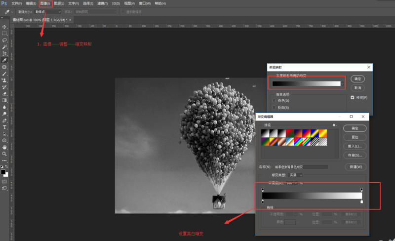 方法 5. 使用渐变映射,选择菜单栏中"图像"——"调整"——"渐变映射",在弹出的渐变映射窗口中,点击渐变条弹出"渐变编辑器"窗口,设置一个黑白渐变,点击确定也可实现黑白效果。