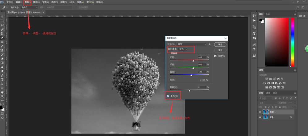 方法 6. 通过 PS 的通道混合器来进行调整,选择菜单栏中"图像"——"调整"——"通道混合器",在弹出的"通道混合器"设置窗口中,将下方的"单色"勾选,输出通道选择为灰色,适当的调整滑动条,点击确定即可。
