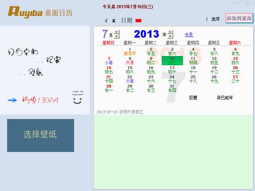 Ruyiba 桌面日历是一款放置在桌面上的很酷的日历软件,方便查询国历. 农历. 星座及记事功能,也可将日历半透明的放在任意你所喜爱的桌面背景图象上,制作成日历壁纸,简单二步骤不占用电脑资源及内存。
