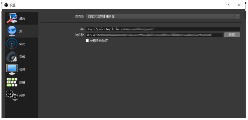 4、进入设置界面,点击"流"菜单,选择"自定义流媒体服务器",粘贴刚才复制的抖音直播推流地址;注意,将 URL 和流名称分开填写,前半部分 URL 开头的为 URL 地址,后半部分 stream —— 开头的为流名称,