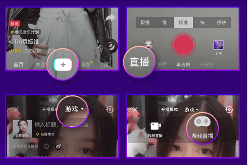 1、打开抖音 APP,登录软件,点击中间的"+",选择"直播",然后选择游戏直播模式,输入直播的名称,进行相关设置,点击"开始直播",