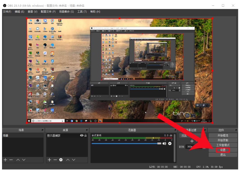 3、回到 OBS Studio 软件,如图,点击窗口右侧的"设置"选项,