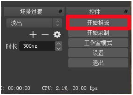 5、如图,点击"开始推流",如果你的设置没有问题,OBS 就会开始推送画面;请注意,获取到直播推流地址以后必须尽快开启推流,10 分内无推流画面将会关闭直播。