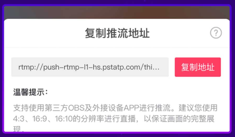 2、如图,复制此次直播的推流地址,
