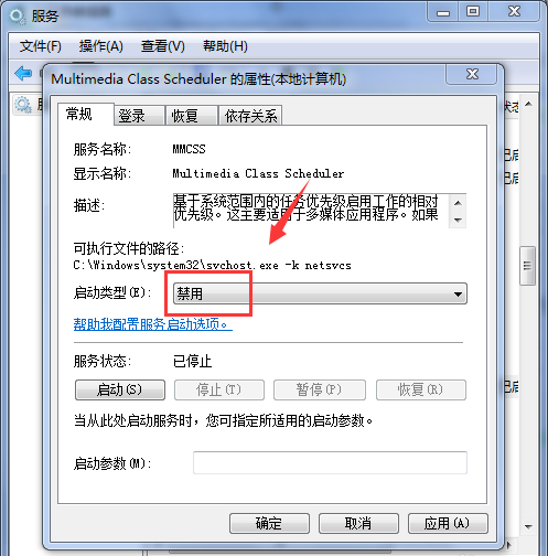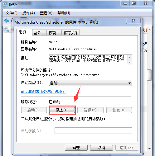 弹出窗口,点击"常规"——"停止",停止 "MMCSS" 服务,