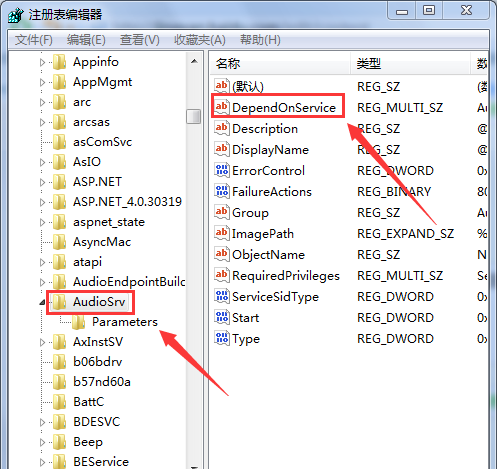 打开注册表编辑器,在左侧依次展开"HKEY_LOCAL_MACHINE/SYSTEM/CurrentControlSet/Services/Audiosrv",然后在右侧窗口找到"DependOnService" 字符串值并双击,