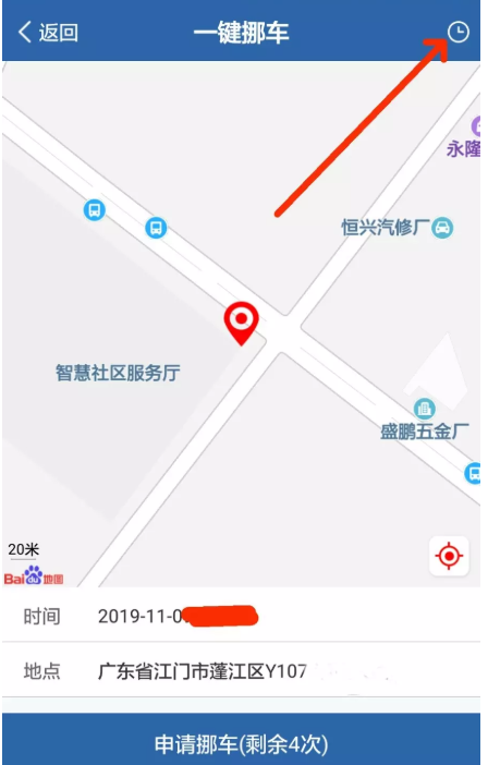 返回一键挪车服务窗口,点击右上角的时钟图标,查看挪车记录,如图,点击相关申请记录,可以查看处理情况,