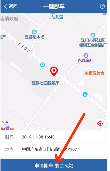 进入一键挪车服务窗口,如图,这里会显示你当前所在位置,你需要进行确认;如果地址不准确,可以移动地图进行调整,然后点击下方的"申请挪车",