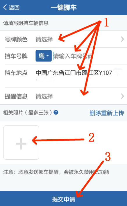 进入以下界面,根据提示进行操作,填写阻挡车辆信息,包括车牌颜色、车牌号,确认挡车地点,选择"提醒信息",点击"+",拍摄相关照片进行上传,最后点击"提交申请",等待对方挪车。