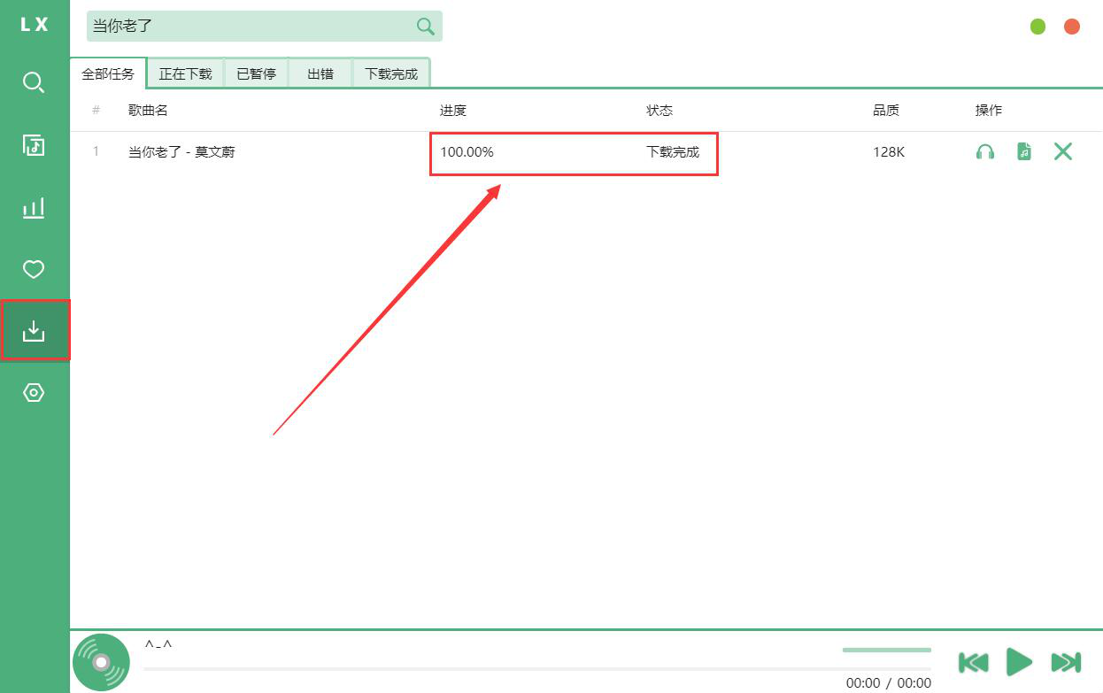 7. 最后,我们切换至洛雪音乐助手的"下载"界面,可以看到歌曲已经下载完成。