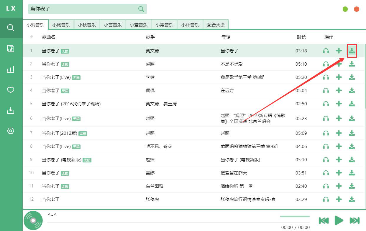 5. 此时,搜索结果都展示出来了,我们点击自己想要下载的歌曲中的下载按钮,洛雪音乐助手便开始下载歌曲。