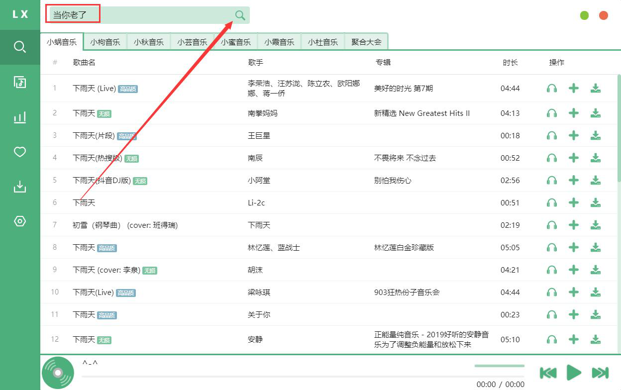 4. 接下来,我们切换至洛雪音乐助手的搜索界面,在搜索框中输入自己想要下载的歌曲,再点击搜索按钮。