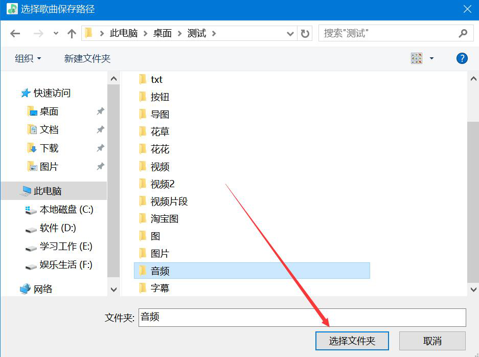3. 然后,在洛雪音乐助手弹出的窗口中,我们选择歌曲下载后的保存路径,再点击"选择文件夹"按钮。