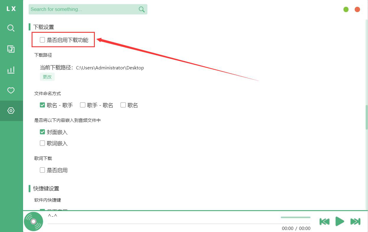 1. 首先,我们打开洛雪音乐助手,切换至它的"设置"界面,找到下载设置,勾选"是否启用下载功能"选项。
