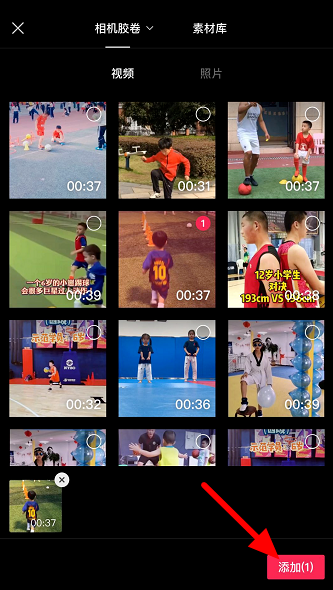 进入手机相册,选择视频,点击"添加",