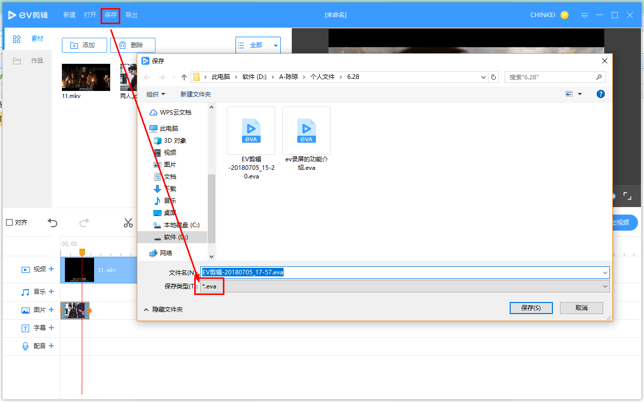 视频剪辑完成,点击上方的"保存"按钮,此时你将视频保存为"工程文件",格式为".eva",所以没办法进行播放。剪辑完成,你需要点击"导出"按钮,导出保存视频,才能正常播放。