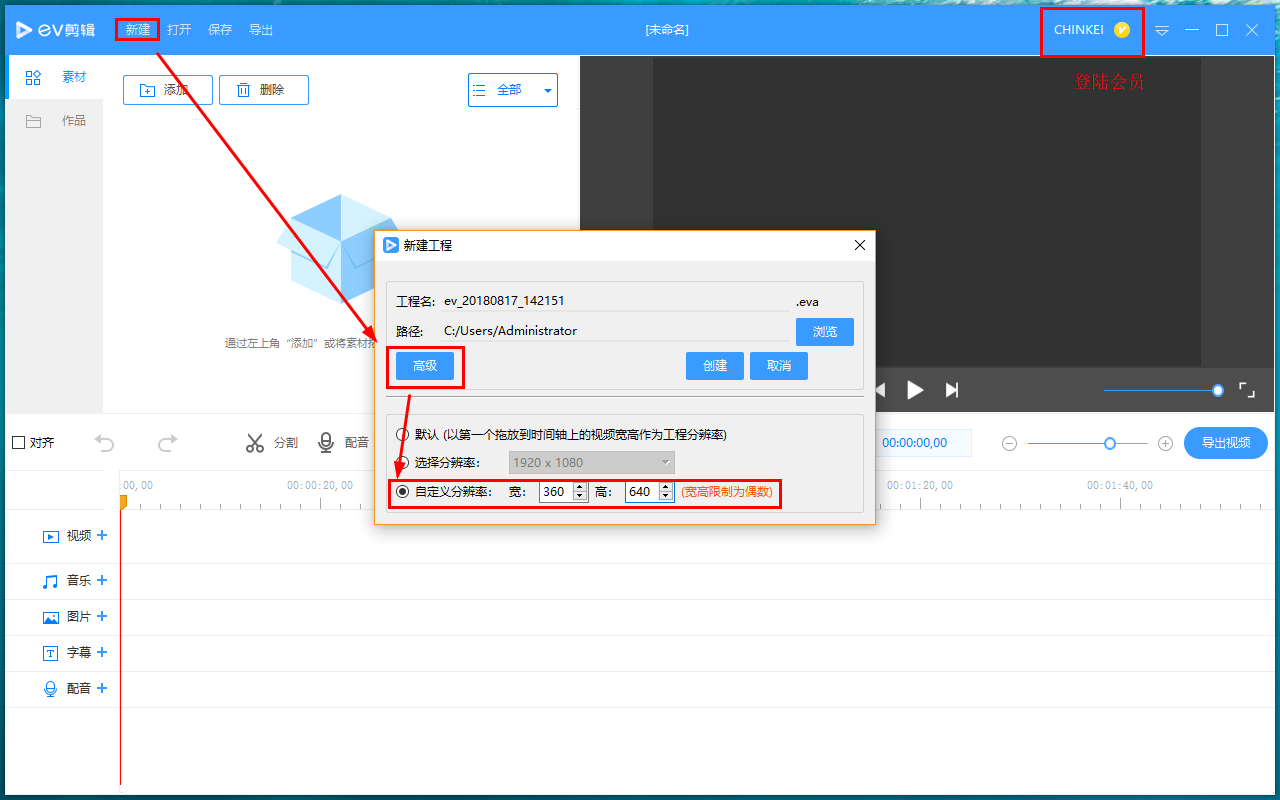 打开 EV 剪辑软件,进入界面,登录会员账号,点击"新建",弹出面板,选择"高级",勾选"自定义分辨率",设置宽高为 360 X 640,