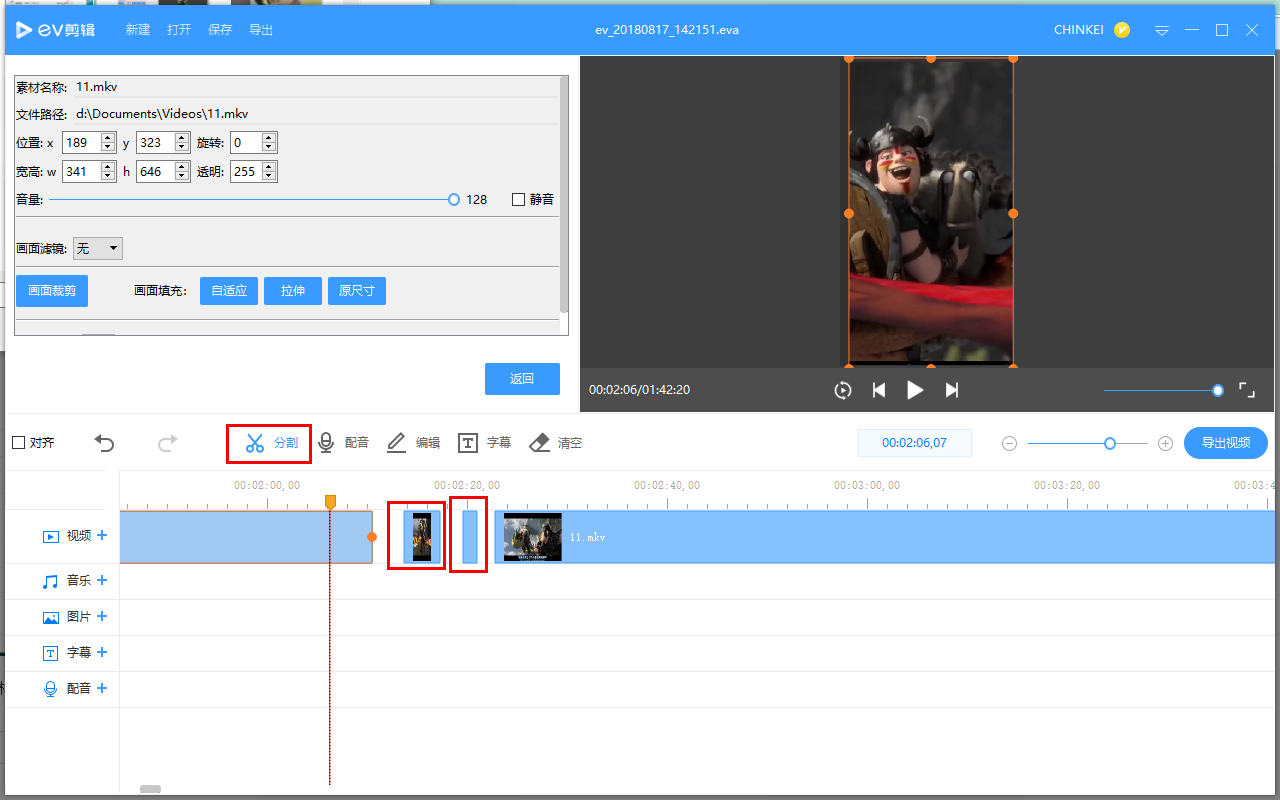 使用 EV剪辑 软件进行视频分割,并将多余片段进行删除,最后将视频导出,发现视频画面出现了黑屏,原因在于你没有将剩余的视频进行拼接,导致中间留有空缺。