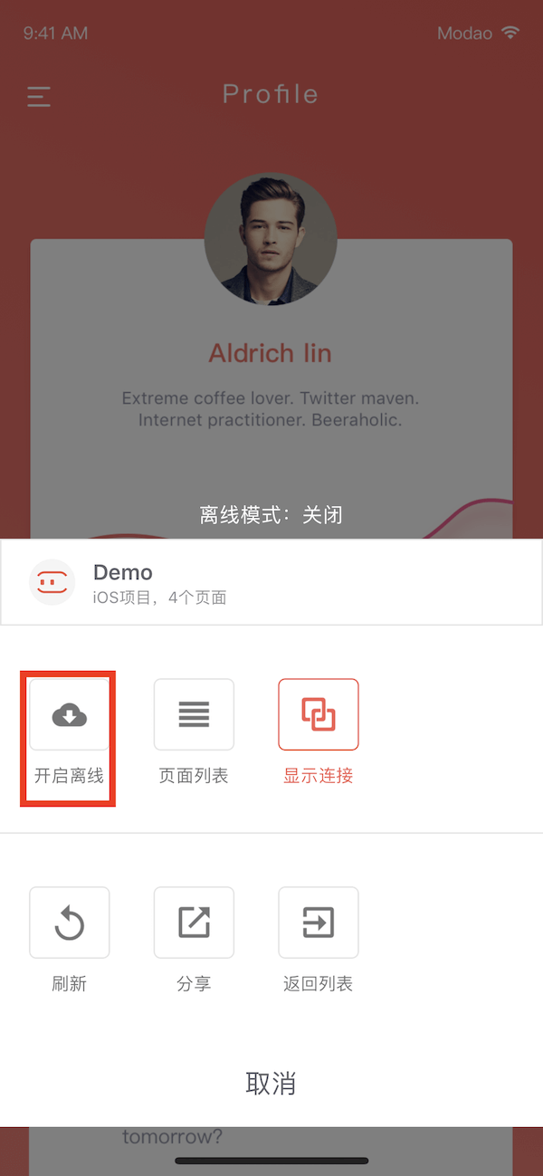 方法 3.在手机端下载安装墨刀 APP,登陆账号,点击进入项目,双指点击屏幕调出菜单,选择"开启离线",即可在手机上演示产品原型。