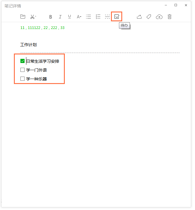 笔记编写过程中可以添加待办事项,如图,点击"待办",出现方框,输入内容事项,只要完成任务,你就来点击打"√",