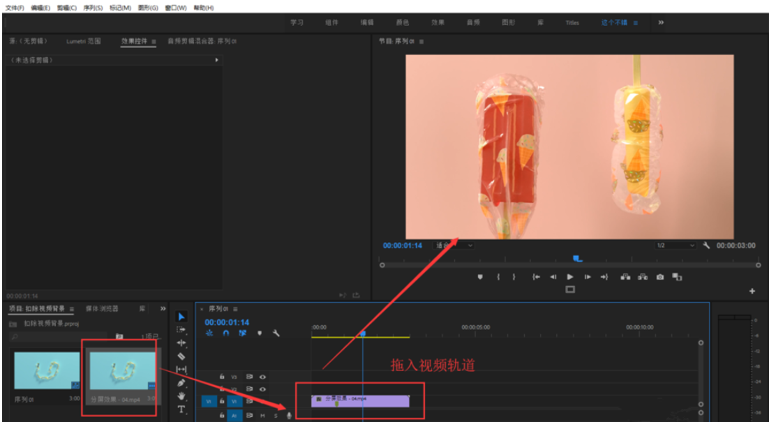 将视频导入 PR 软件,选中视频,将其拖动至视频轨道,