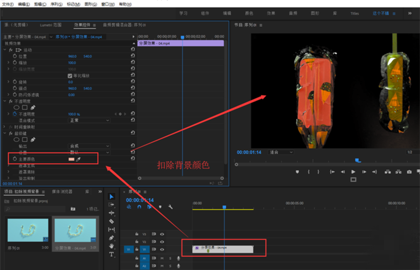 选中视频,打开"效果控件"窗口,找到"超级键"——"主要颜色",用吸管工具吸取视频背景颜色,PR 会根据色彩容去除与背景相近的颜色,最终效果如图。