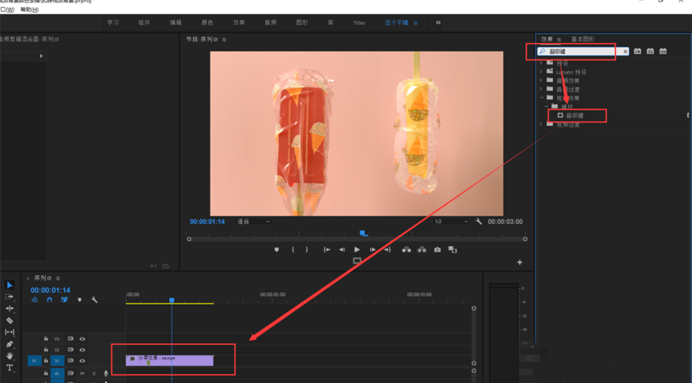在效果窗口中输入"超级键",进行搜索,选中超级键效果,将其拖动到视频文件中,