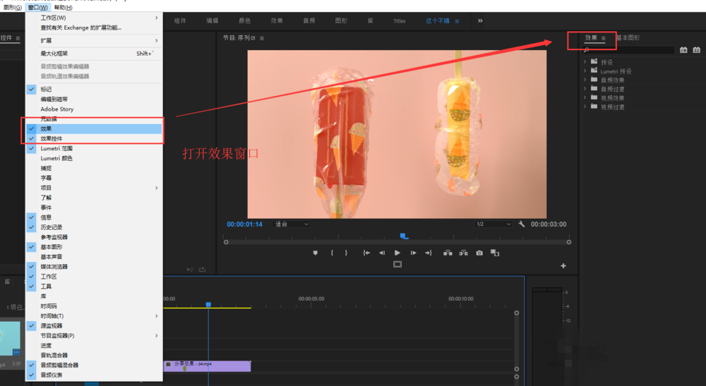 展开"窗口"菜单栏,找到"效果"并勾选,让其显示在窗口,