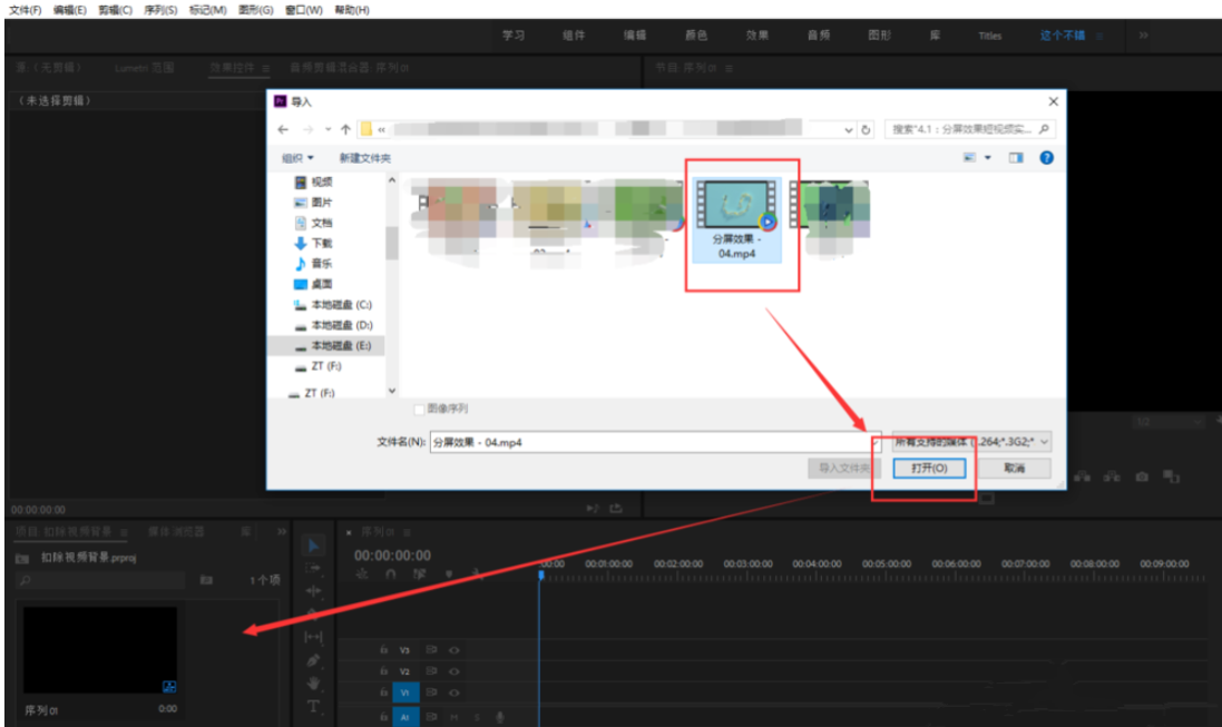 按快捷键"Ctrl + I",弹出一个导入窗口,选择一个视频素材,