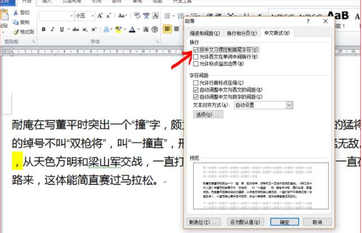 2. 在打开的"段落"对话框中,单击"中文版式"选项卡,勾选"按中文习惯控制首尾字符"。