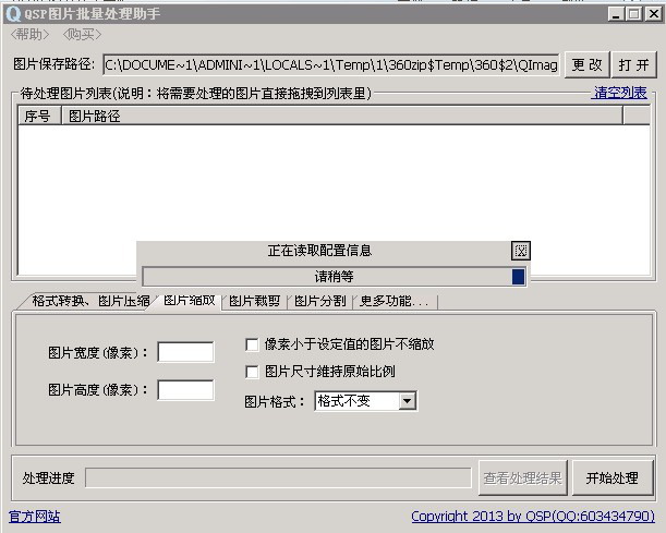 QSP 图片批量处理助手支持批量转换图片格式. 图片批量缩放(批量修改图片的尺寸. 像素). 图片批量裁剪功能。软件操作简单,打开程序后看到界面就知道怎么使用了。