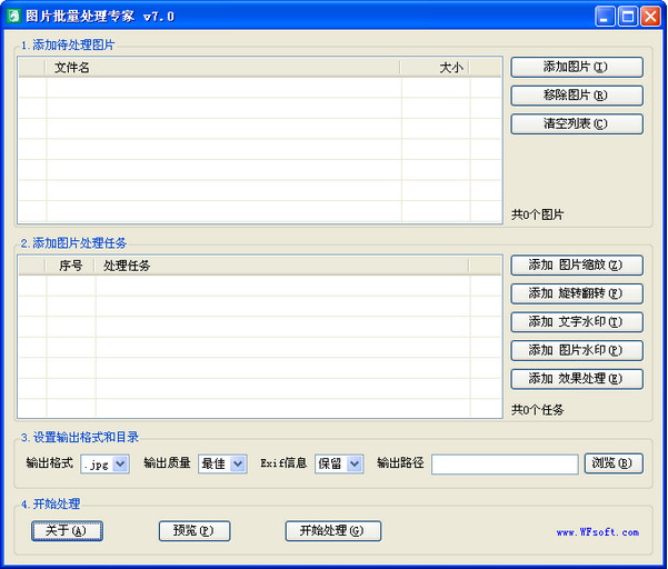图片批量处理专家是一款简单实用的图片批量处理软件,拥有图片批量加水印. 修改大小. 图片压缩. 添加文字水印. 图片水印. 调节亮度. 调节对比度. 黑白处理. 支除 exif 信息. CMYK 转 RGB 等功能,并支持一次性批量处理。软件界面简洁,操作简单,用户只需添加需要处理的图片,再设置好相应的参数后,即可一次性生成 jpg 图片,推荐给淘宝卖家. PS爱好者使用。