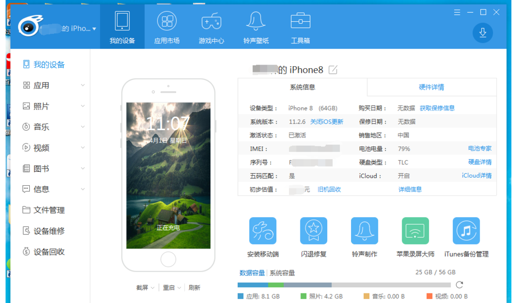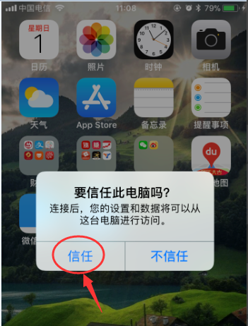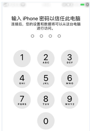 驱动安装成功,使用数据线连接 iPhone 手机和电脑, iTools 会自动识别手机设备,如图,手机中会有提示,选择信任,并输入密码验证,