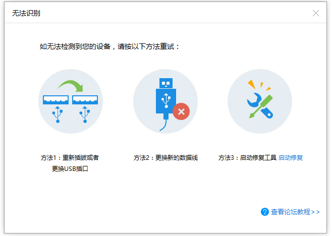 如果连不上手机,点击应用兔软件界面中的"已连接,但无法识别"提示,这里有三种方法,有可能是USB接口接触不良,换一个USB接口;或者换一根数据线进行重新连接;也可以启动修复工具进行修复,看看问题是否解决。