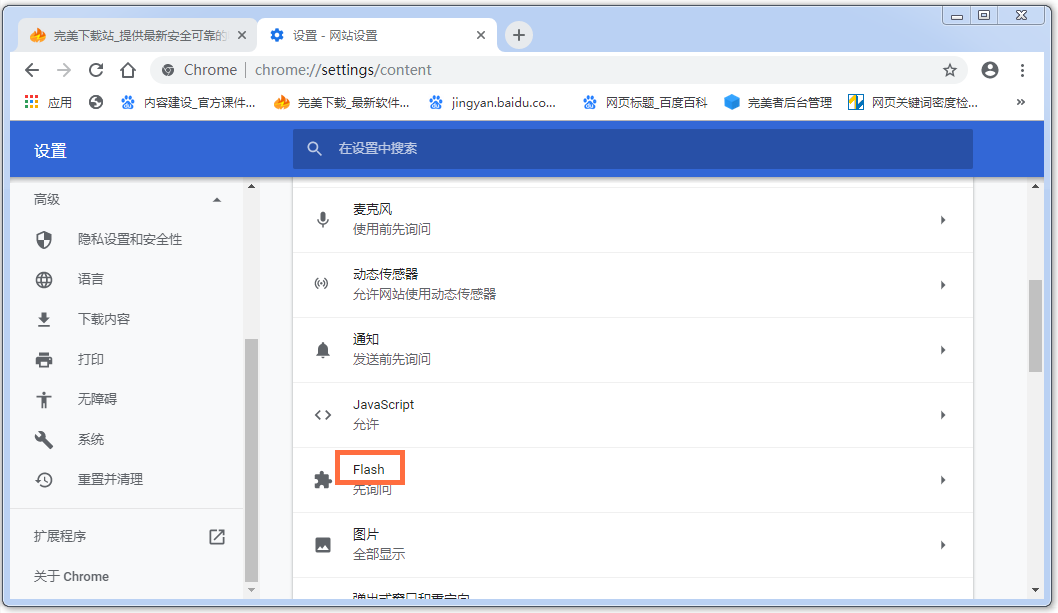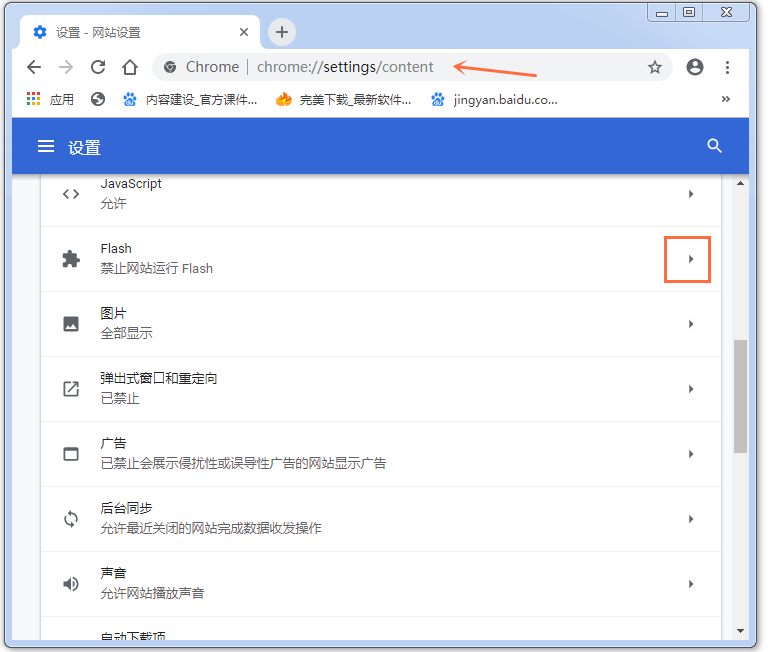 或者,你可以直接在地址栏输入"chrome://settings/content",找到并点击" Flash "选项,