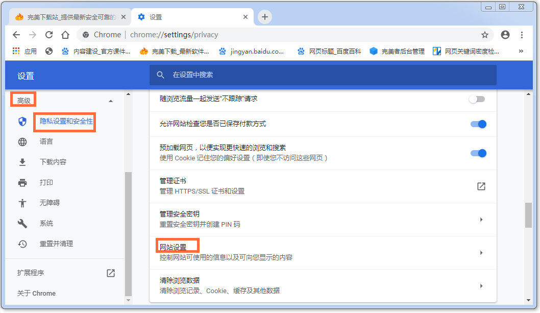 进入设置界面,在左侧点击"高级",选择"隐私设置和安全性",然后找到"网站设置"功能,