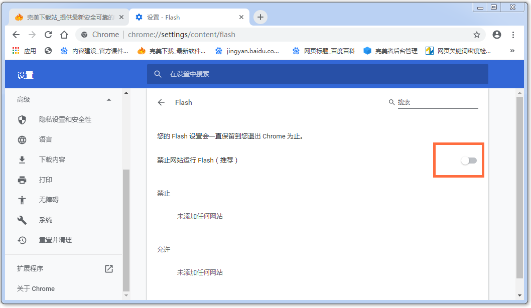 进入界面,点击"禁止网站运行 Flash ",系统默认是关闭的,将其打开,即可解决问题。